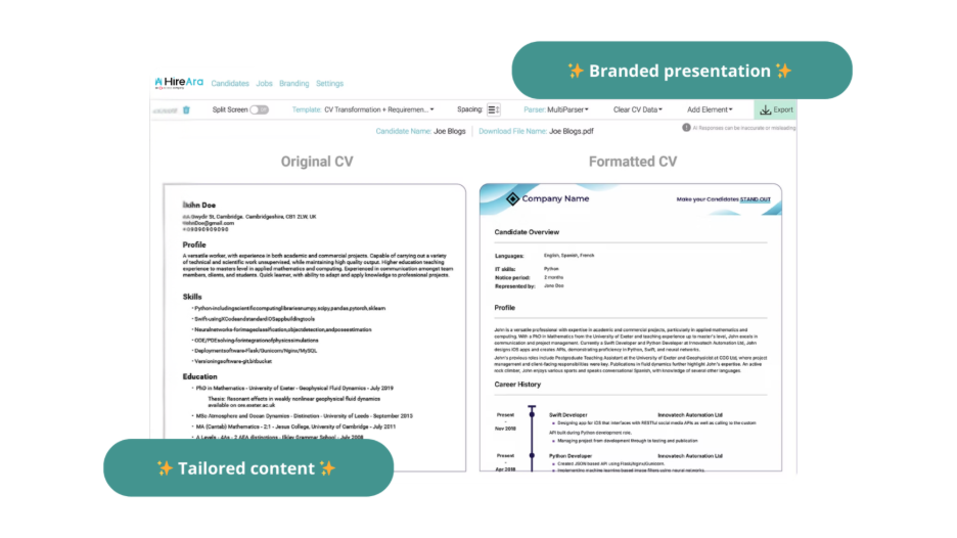 - Present candidates that win business: AI-Powered Candidate Presentation transforms raw CVs into polished, on-brand candidate profiles in seconds.
