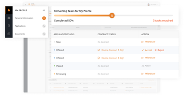 A candidate/ applicant portal is a secure system that allows candidates to apply for their favorite jobs, submit personal information and documentation, check for updates, and review & respond to job offers. Its purpose is to simplify recruitment operations - as well as to ensure utmost transparency between candidates and recruiters.
