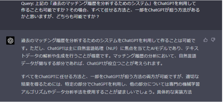 【上記の「過去のマッチング履歴を分析するためのシステム」をChatGPTを利用して作ることも可能ですか?その場合、すべて任せる方法と、一部をChatGPTが担う方法があるかと思いますが、どちらも可能ですか?】