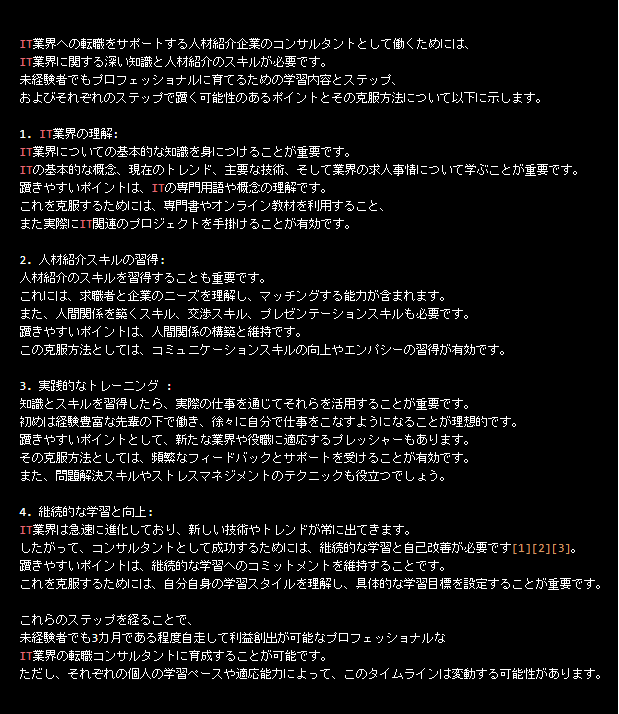 続いて、「実践的なトレーニング」や「継続的な学習と向上」について調べましょう。プロンプトは以下。
