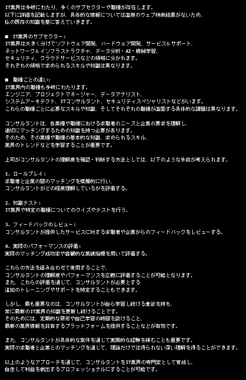 サブセクターや職種への理解はIT業界においては必須かと思います。こういったポイントは恐らく各業界にありますが、その基本的な枠組みを最初にインプットできるだけでも、ChatGPTは有効に思います。