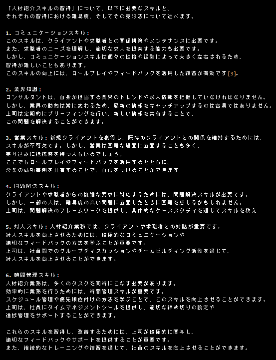 続いて「人材紹介スキルの習得」の部分をより深く理解して育成をスムーズに行いたいです。必要なスキルのリストアップと、各スキル習得にあたって躓きやすいポイント、上司を巻き込んだその改善の方法を教えてください。