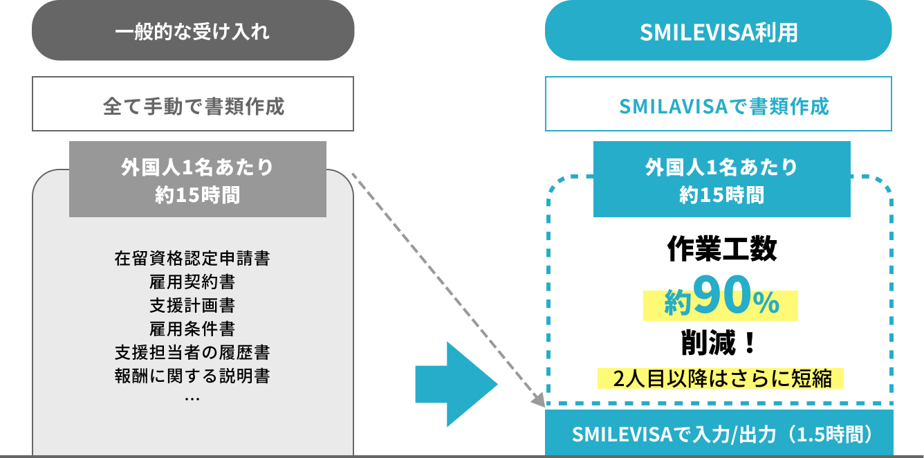 私たちは「受入れのハードル」という社会課題に対して、どんな企業でも特定技能外国人を受入れる選択肢が当たり前になる世界を目指し、SMILEVISAを開発しました。