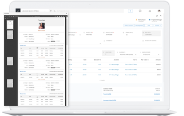 タイムシートが承認されると売上、購買、クレジットの請求書が自動的に作成されるので、確認するだけですぐに送付可能。小数点以下4桁までの多通貨に対応。
