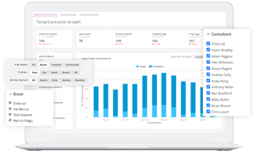 See what’s happening across your agency—live. TimeTemp’s analytics tools give you instant access to consultant performance, contractor growth, and pay rule accuracy, all in one AI-powered dashboard.